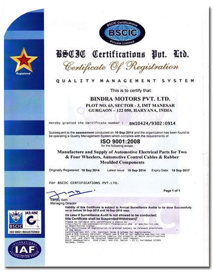 Bindra Motors believes that final arbiater of quality is the customer and hence quality begins and ends with the customer. For the company quality is not just adherence to drawing or specification but job satisfaction for us and satisfaction for the customer. Bindra Motors in its quest for quality and excellence has received ISO 9002 certificate from and now it has plunged into activity to achieve TS 16949 Systems